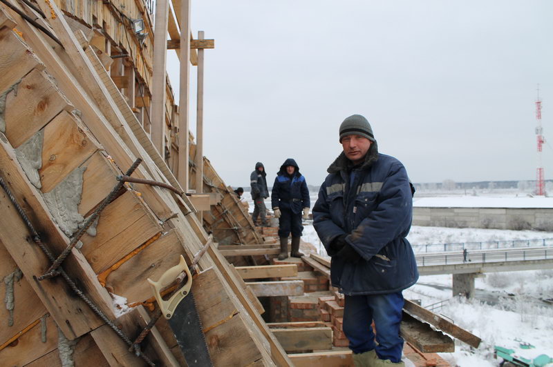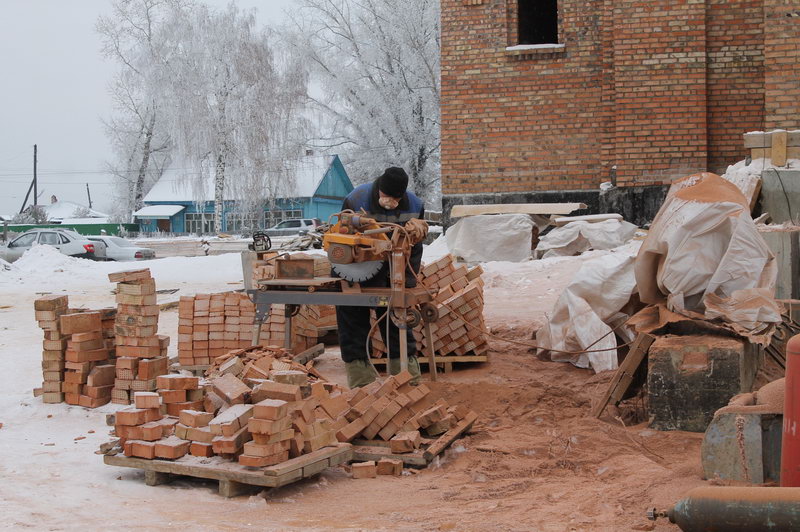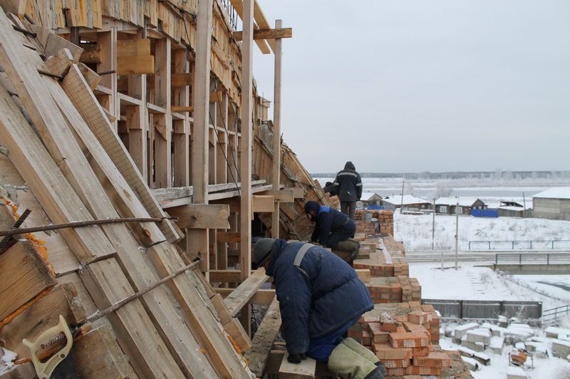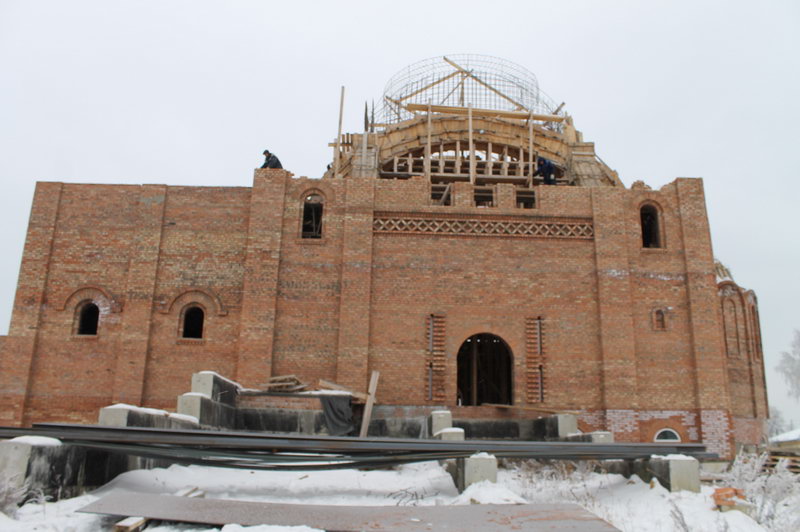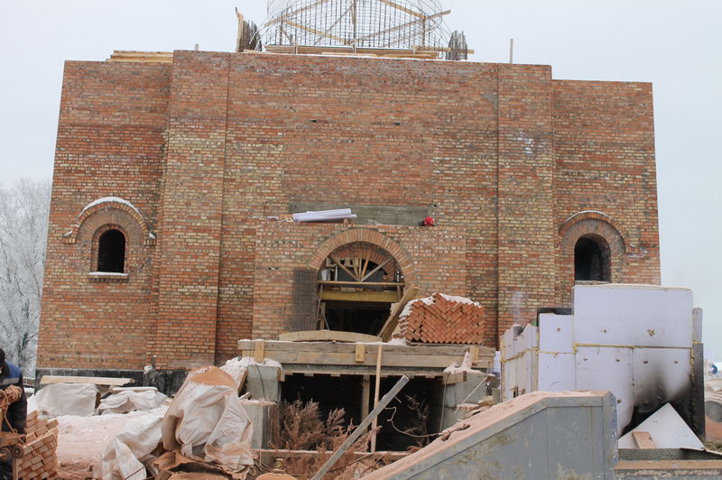 Строительство Храма продолжается. Идет кладка кирпичей с южной стороны Храма а также подготовка заливки плиты под колокольню.