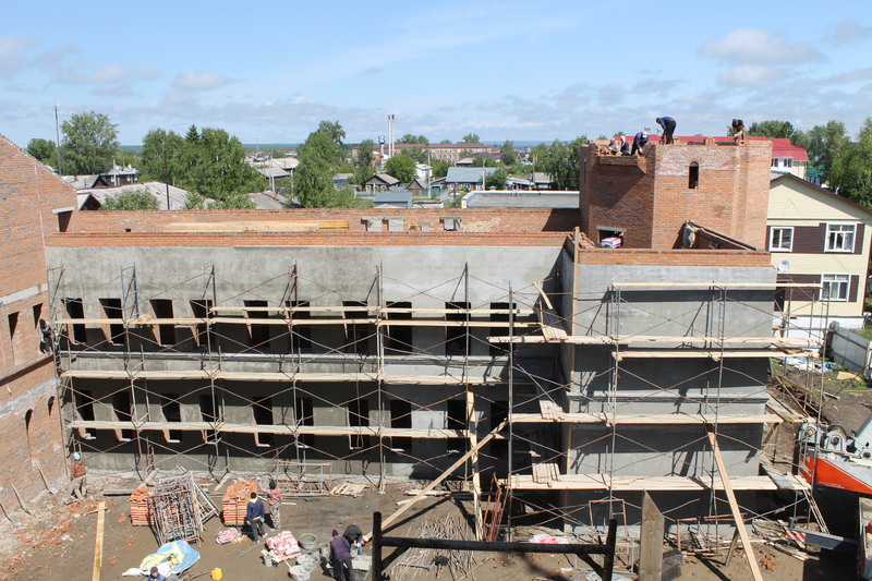Бригады строителей подрядчика Овсепяна Пипана Сарибековича начинают внешнюю отделку второго корпуса, идут подготовительные работы к кровельным работам, продолжаются работы второго этажа первого корпуса.