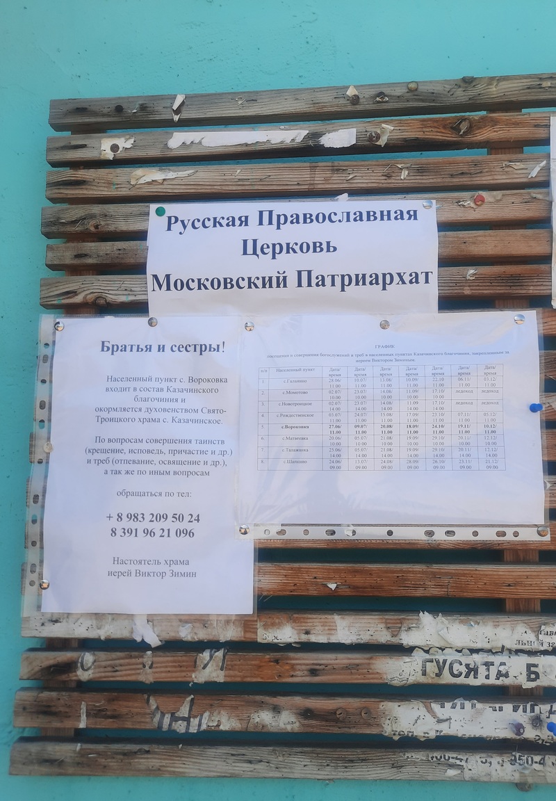 По благословению епископа Енисейского и Лесосибирского Игнатия благочинный Казачинского округа настоятель Свято-Троицкого храма с.Казачинское иерей Виктор Зимин с клиросом сестрой Натальей совершили миссионерские поездки по населенным пунктам района. Посетили села Вороковка — 27 июня и Галанино — 28 июня. Местные власти предоставили помещения для совершения молебнов в зданиях учреждений культуры. Были отслужены водосвятные молебны, к собравшимся о.Виктор обратился со словом проповеди. На стендах размещены объявления о предполагаемых посещениях этих населенных пунктов священником и контактных телефонах.