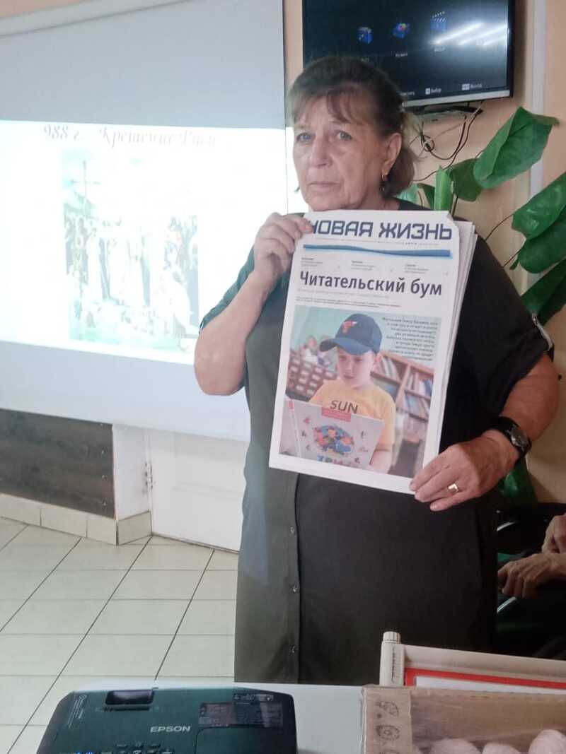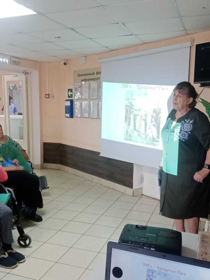 Проведена беседа о крещении Руси, датах православного календаря за август месяц с применением слайдов и коллективным чтением районной газеты с публикациями о датах православного календаря. О дне Серафима Саровского, Илии Пророка, Феодоре Ушакове, Пантелеймоне - исцелителе, православных иконах. Общение закончилось угощениями.