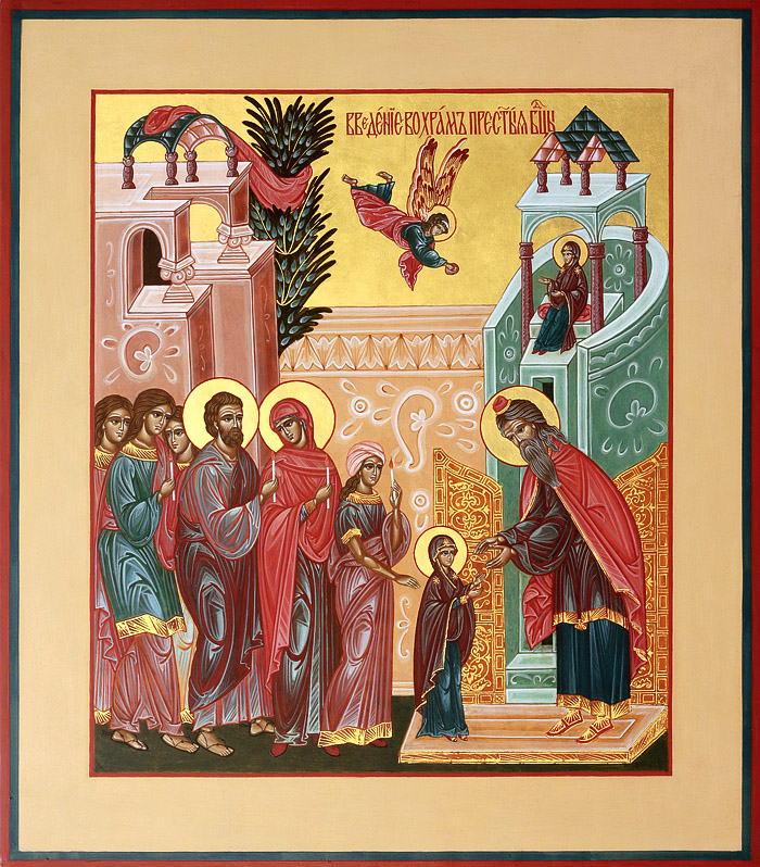 Согласно преданиям, когда Деве Марии исполнилось 3 года, Её родители, праведные Иоаким и Анна отдали свою Пречистую дочь на служение Господу. Собрав родственников и знакомых, с зажженными свечами в руках родители привели Деву Марию в Иерусалимский храм. Там встретил Богоотроковицу первосвященник Захария. По внушению свыше Захария ввёл Её во Святая Святых, куда имел право входить только первосвященник однажды в год.