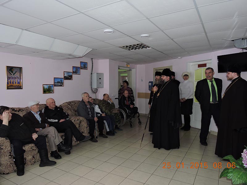 По окончанию Божественной литургии Преосвященнейший Никанор в сопровождении отца Виктора и духовенства Енисейской епархии посетили пансионат для граждан пожилого возраста и инвалидов «Прибрежный». Каждый житель пансионата имел возможность пообщаться с членами Енисейской епархии, рассказать о своих проблемах и получить совет. Владыка Никонор окропил ветеранов и инвалидов святой крещенской водой, и благословил иконами Нерукотворного Образа Спасителя. Преосвященнейший Никанор подарил подарки всем жителям пансионата.
