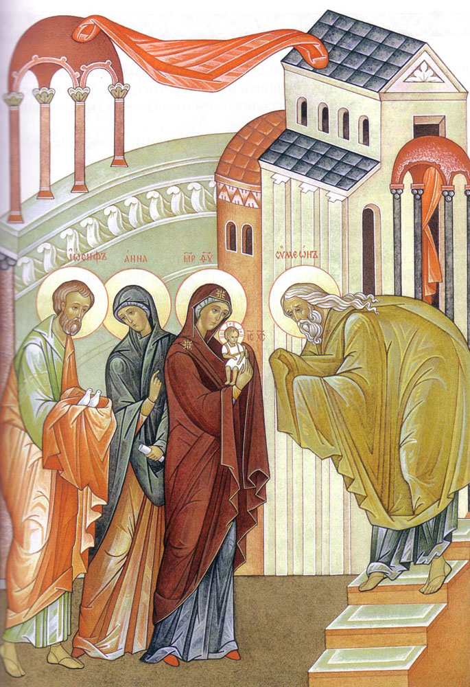Благочестивый старец Симеон по велению Божьему пришел в Храм, чтобы исполнить обряд посвящения Богомладенца. Он взял на руки Иисуса Христа, и благословив Его, изрек пророчество о Спасителе мира: "Ныне отпускаешь раба Твоего, Владыка, по слову Твоему с миром, ибо видели очи мои спасение Твое, которое Ты уготовал пред лицем всех народов, свет к просвещению язычников и славу народа Твоего Израиля" (Лк. 2, 29 – 32)